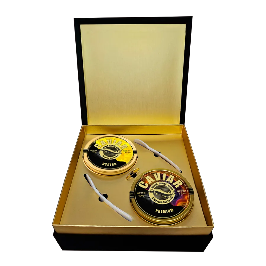 An elegant pairing of Osetra (Russian Sturgeon) 100g and Premium (Siberian Sturgeon) 100g, both sourced from Georgia. Two distinguished sturgeon species presented in a luxury gift box and delivered free across Singapore, fresh and perfectly chilled.
