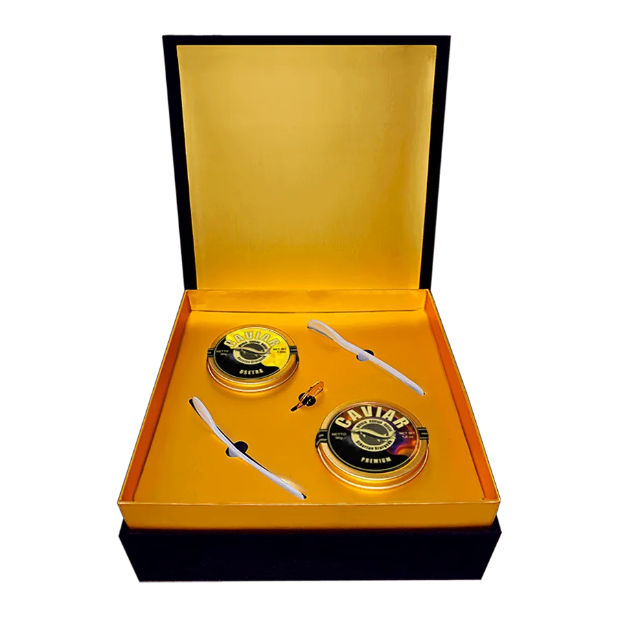 A refined gourmet pairing of Osetra Caviar (Russian Sturgeon) 50g and Premium Caviar (Siberian Sturgeon) 50g, both sourced from Georgia. Two elegant sturgeon varieties presented in a luxury gift box and delivered free across Singapore, fresh and perfectly chilled.